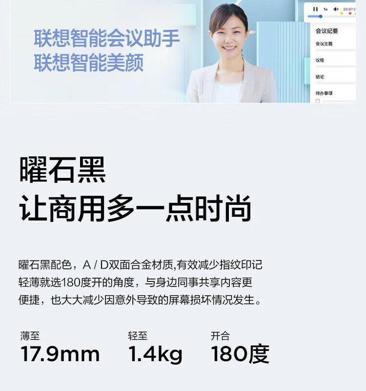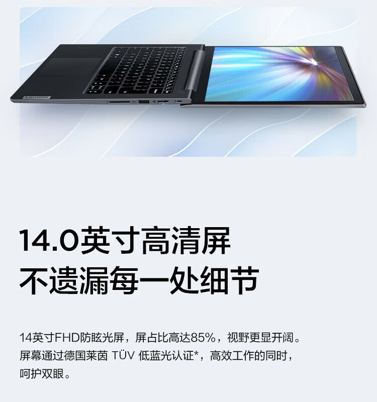 黑色i5-13500H/16G/512G/W11H 曜石黑让商用多一点时尚 曜石黑配色,A/D双面合金材质,有效减少指纹印记轻薄就选180度开的角度,与身边同事共享内容更便捷,也大大减少因意外导致的屏幕损坏情况发生。 薄至17.9mm 轻至1.4kg 开合180度 14.0英寸高清屏不遗漏每一处细节 14英寸FHD防眩光屏,屏占比高达85%,视野更显开阔。屏幕通过德国莱茵TUV 低蓝光认证*,高效工作的同时,呵护双眼。 屏占比85% 分辨率1920*1080