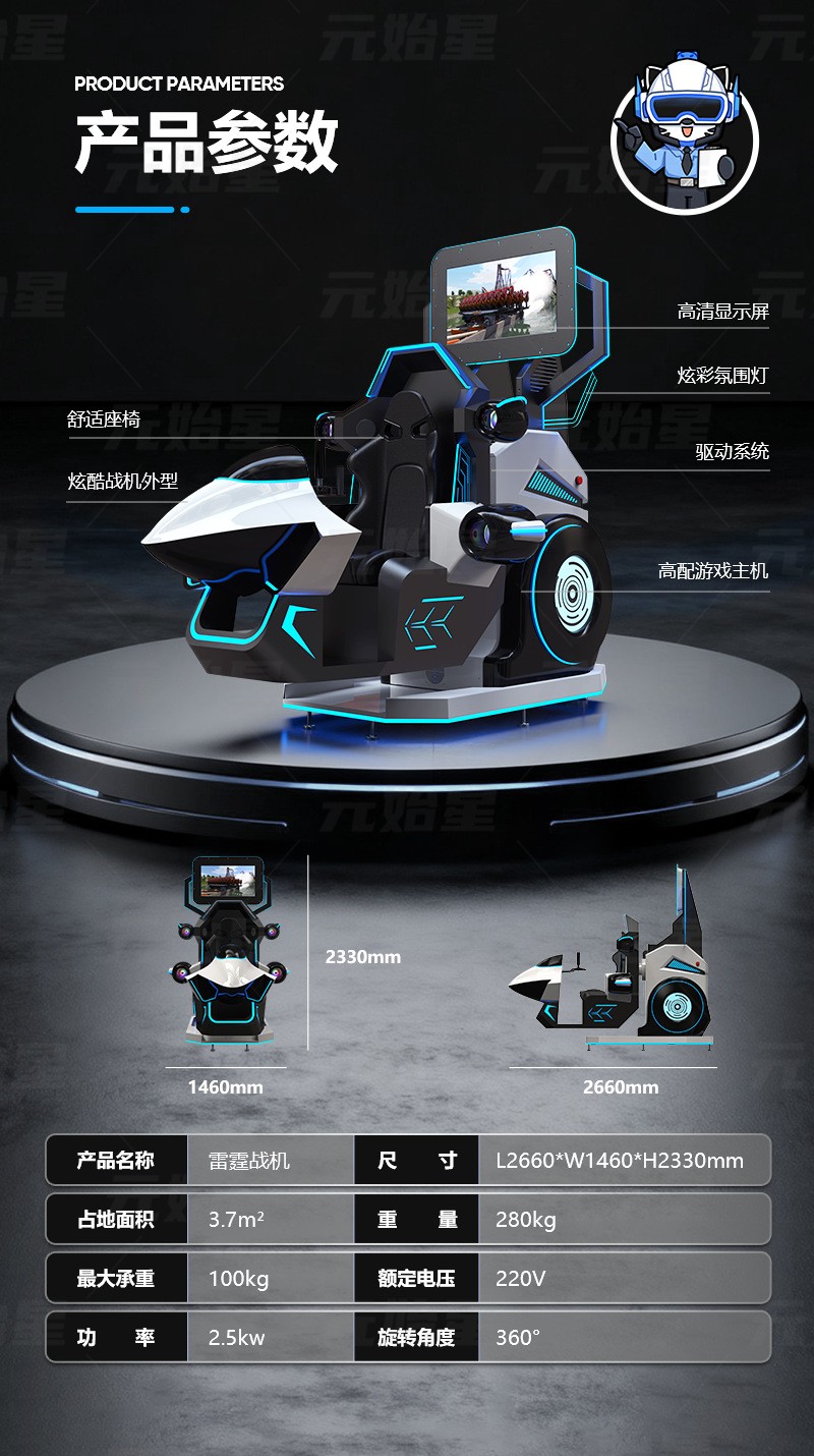 VR X战机太空模拟器,是融合尖端虚拟现实技术、全动感操控系统与太空场景建模的新一代沉浸式设备,以“复刻太空空战,解锁星际漫游”为核心,打造从视觉到体感的全维度太空飞行体验。无论是军事爱好者追求的硬核空战对抗,还是大众渴望的星际探索奇遇,这款设备都能打破时空桎梏,让用户置身浩瀚宇宙,成为驾驭太空战机的“星际飞行员”,广泛适配科技馆、电竞体验馆、商业综合体、军事科普基地等多元场景。 硬核硬件加持,重构太空飞行真实体感。设备采用1:1仿真太空战机驾驶舱设计,机身以高强度玻璃钢材质精雕细琢,搭配人体工程学皮质座椅,贴合身体曲线的同时保障长时间体验的舒适度。核心操控系统复刻专业太空飞行器