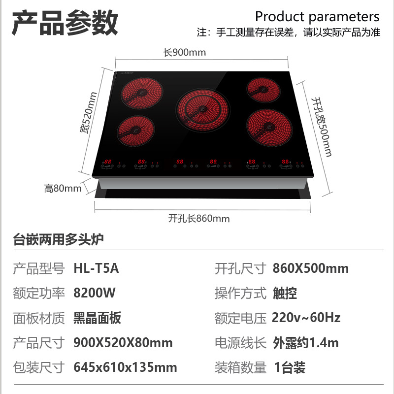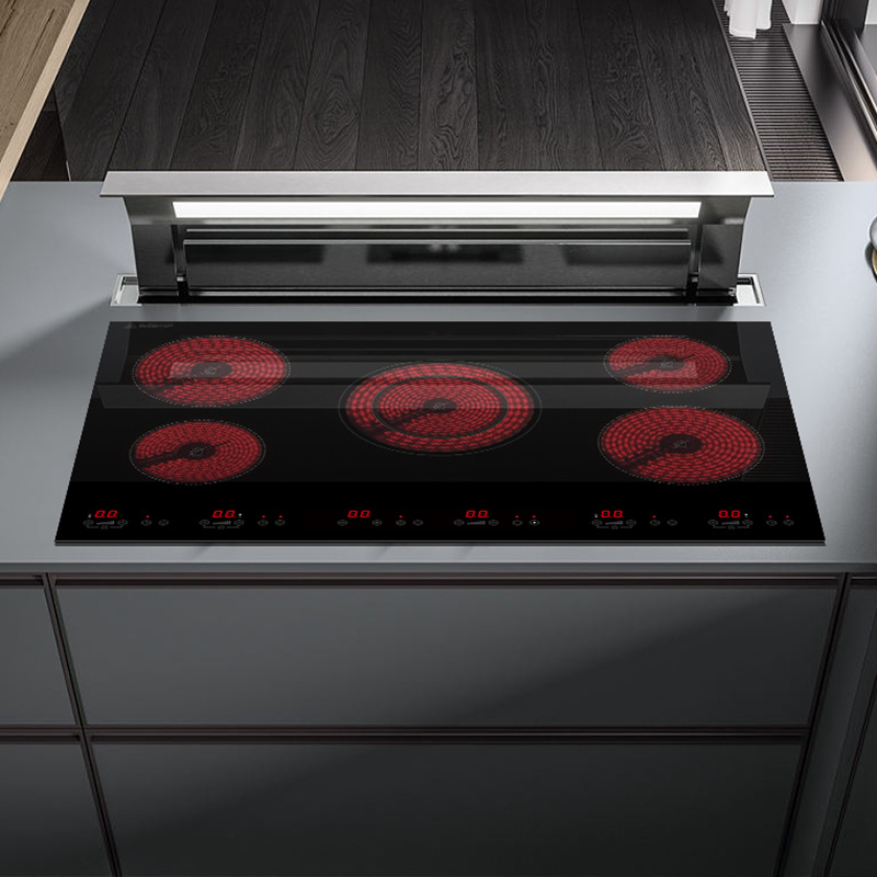 家用嵌入式五头炉(电陶炉+电磁炉二合一款),专为现代厨房量身打造,以“多灶同烹、分区控温、嵌入式美学”为核心,融合电陶炉全域加热与电磁炉高效速热优势,五炉头独立运行互不干扰,轻松满足家庭多人餐、中西餐同做的多元烹饪需求,适配开放式厨房、精装房嵌入式场景,兼顾烹饪效率与厨房空间格调,成为提升居家烹饪体验的核心厨电。