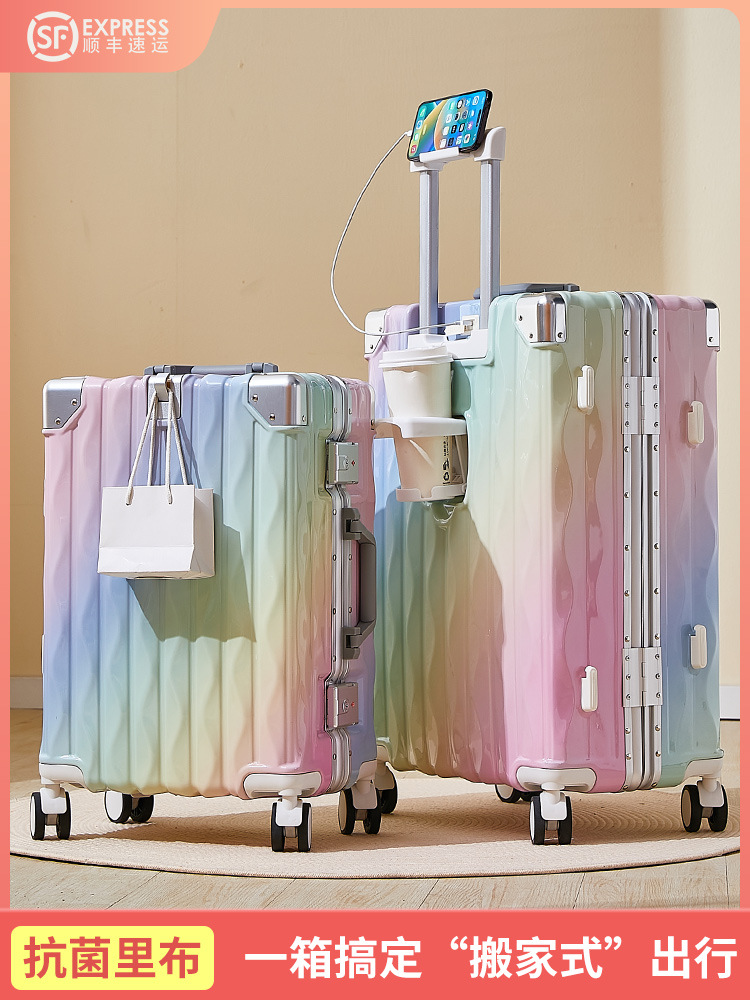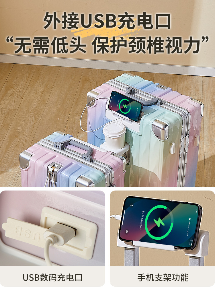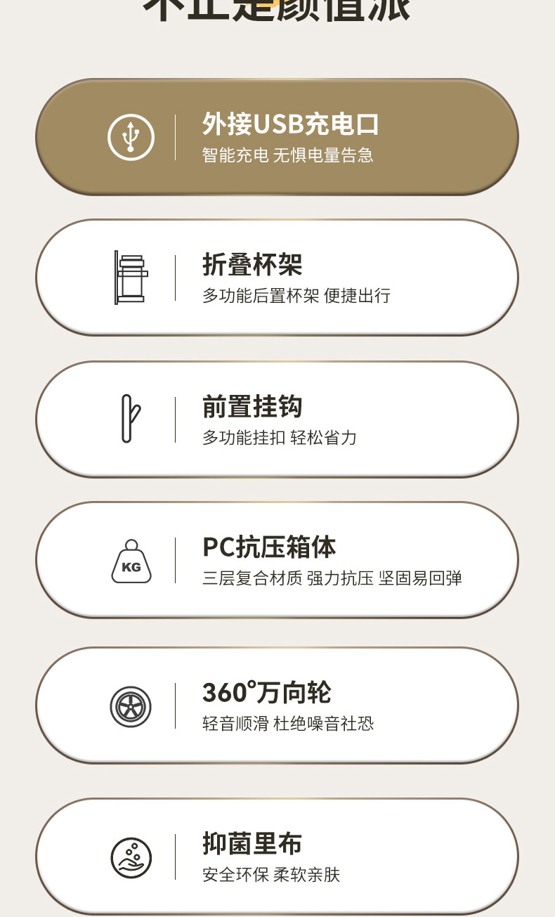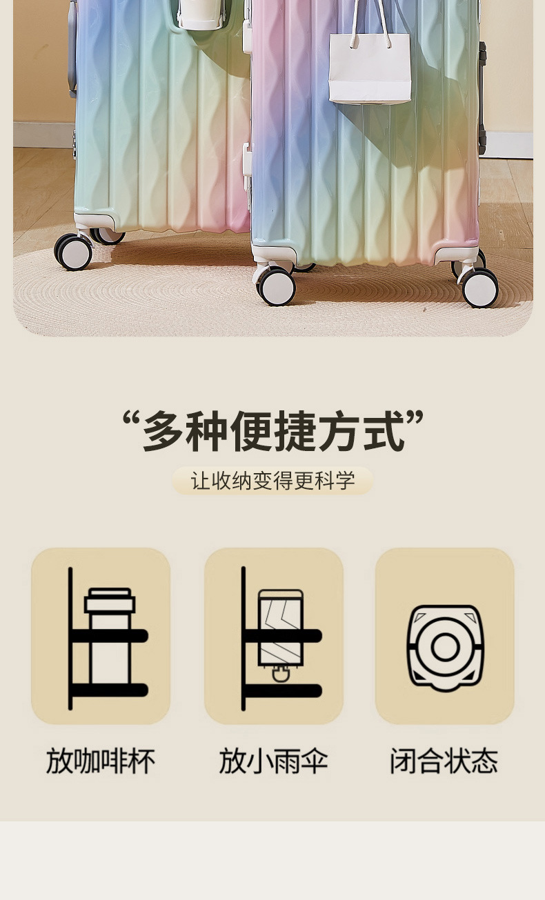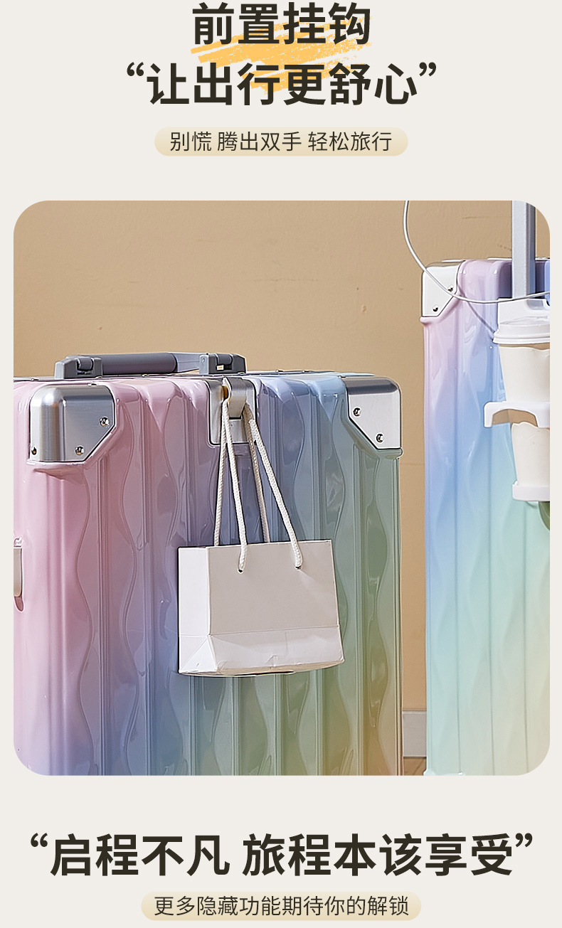 '便捷多功能"多巴胺 出彩高颜值 渐变魅力 启程不凡 直击行业痛点 出行护航"全新升级款" 隐藏式杯架|USB充电|脚钉挂钩