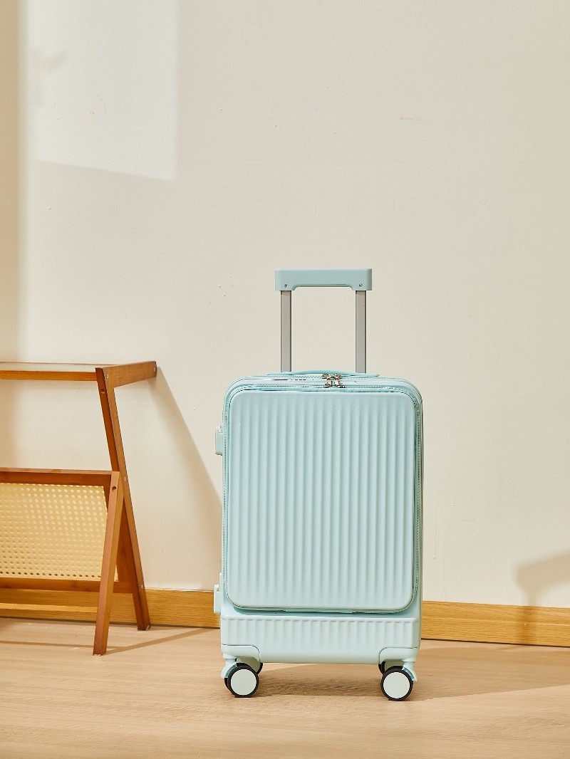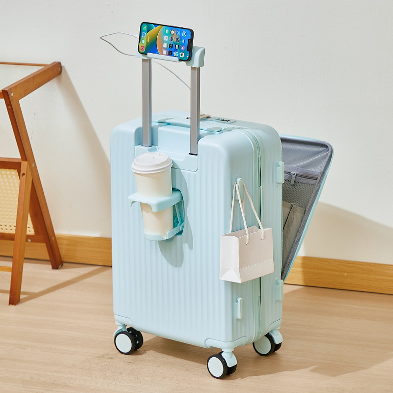 前开盖多功能行李箱 前开盖系列便携取物更方便 突破传统 速存快取优雅出行 前开盖多功能行李箱 新一代开合方式同等尺寸更能装脚钉挂钩|折叠杯架|USB充电口