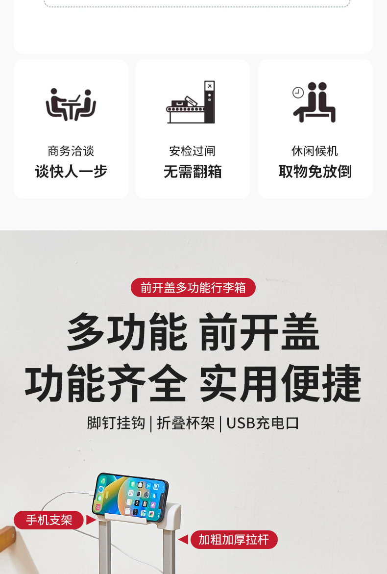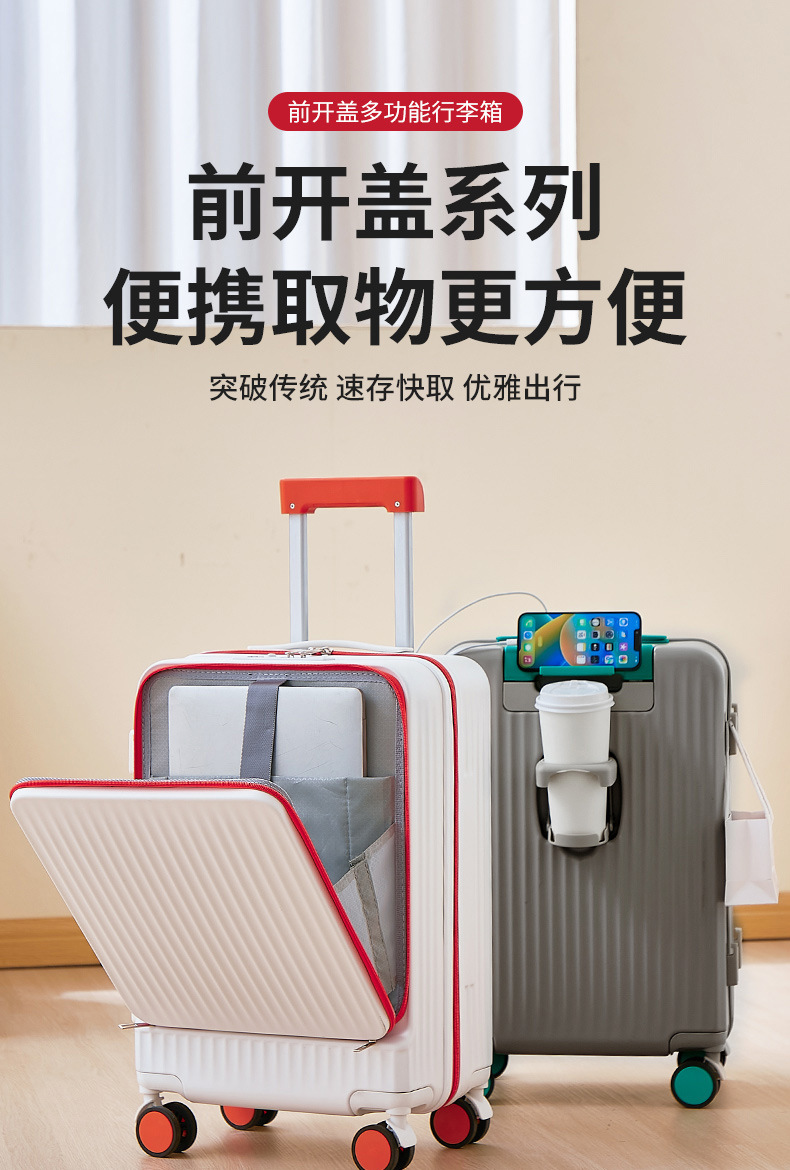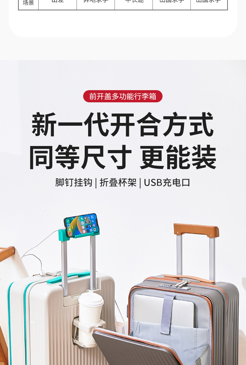 前开盖多功能行李箱 前开盖系列便携取物更方便 突破传统 速存快取优雅出行 前开盖多功能行李箱 新一代开合方式同等尺寸更能装脚钉挂钩|折叠杯架|USB充电口