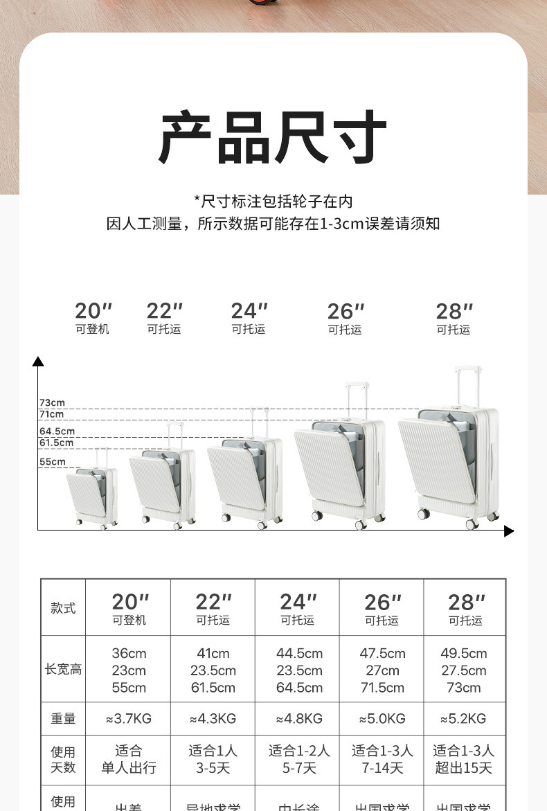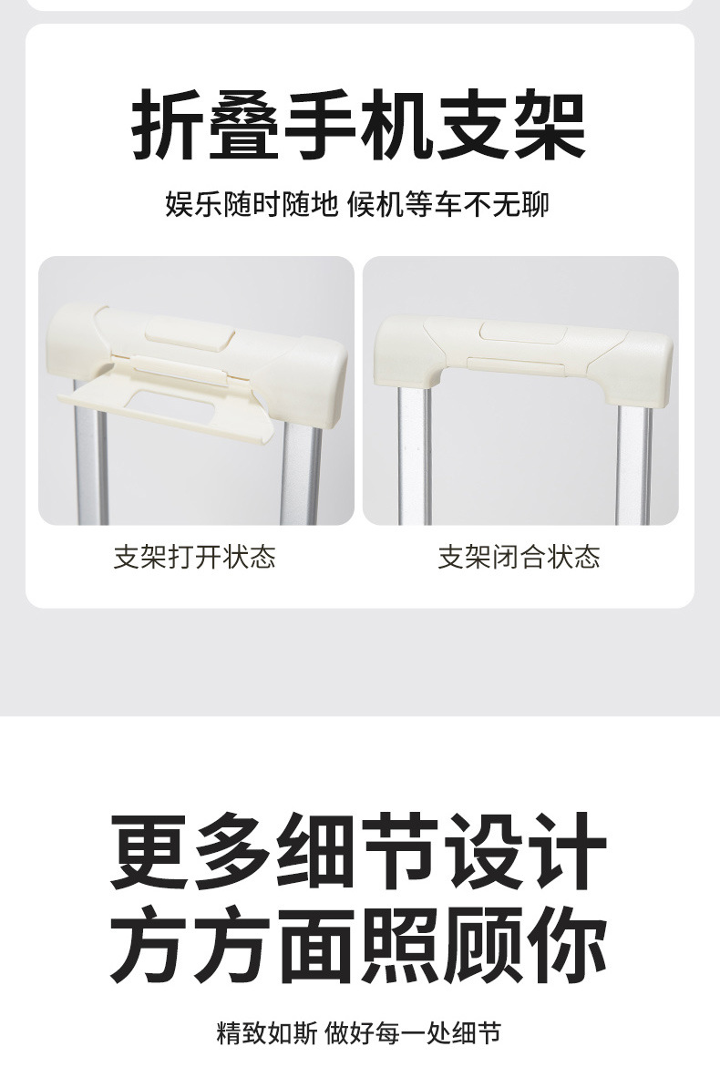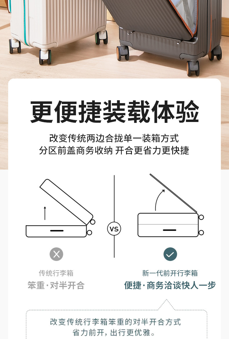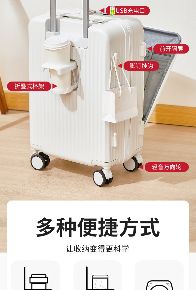 前开盖多功能行李箱 前开盖系列便携取物更方便 突破传统 速存快取优雅出行 前开盖多功能行李箱 新一代开合方式同等尺寸更能装脚钉挂钩|折叠杯架|USB充电口