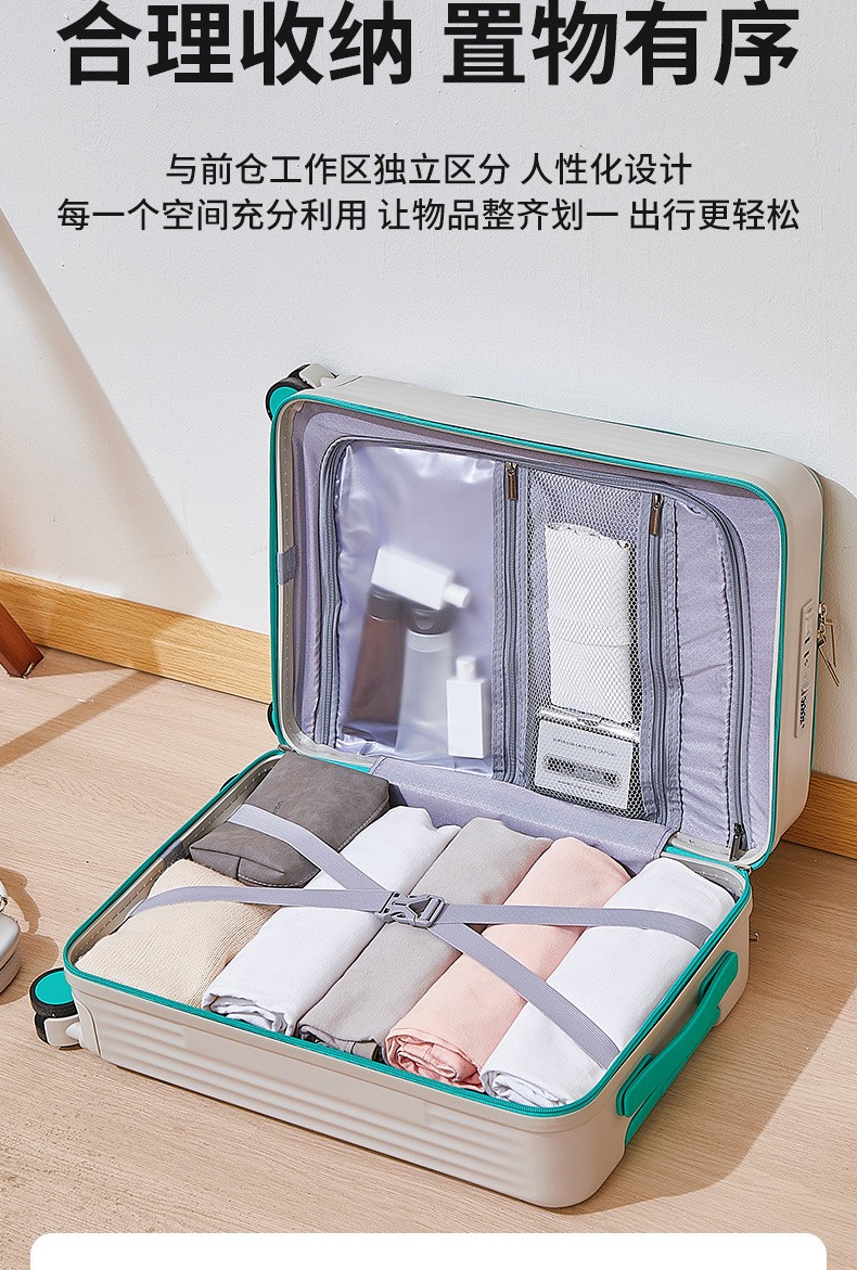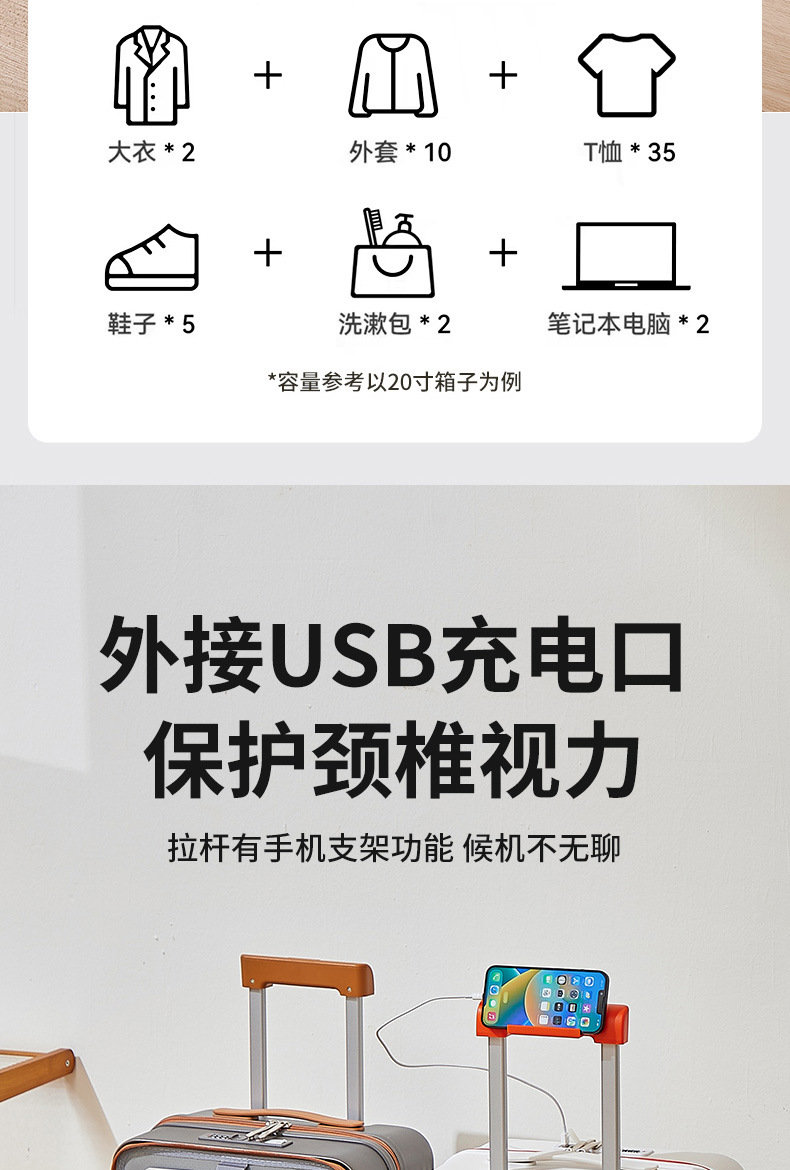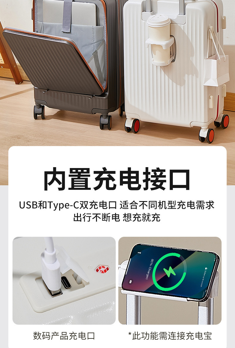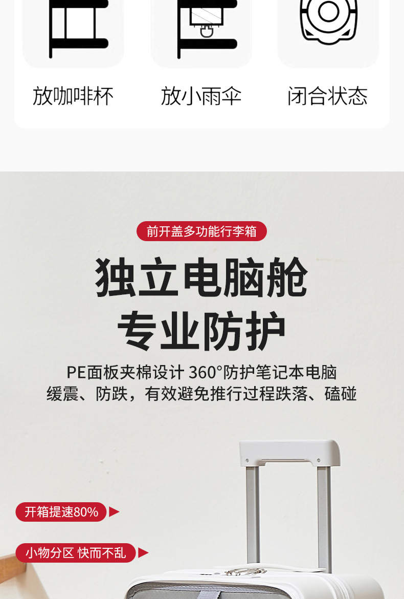 前开盖多功能行李箱 前开盖系列便携取物更方便 突破传统 速存快取优雅出行 前开盖多功能行李箱 新一代开合方式同等尺寸更能装脚钉挂钩|折叠杯架|USB充电口