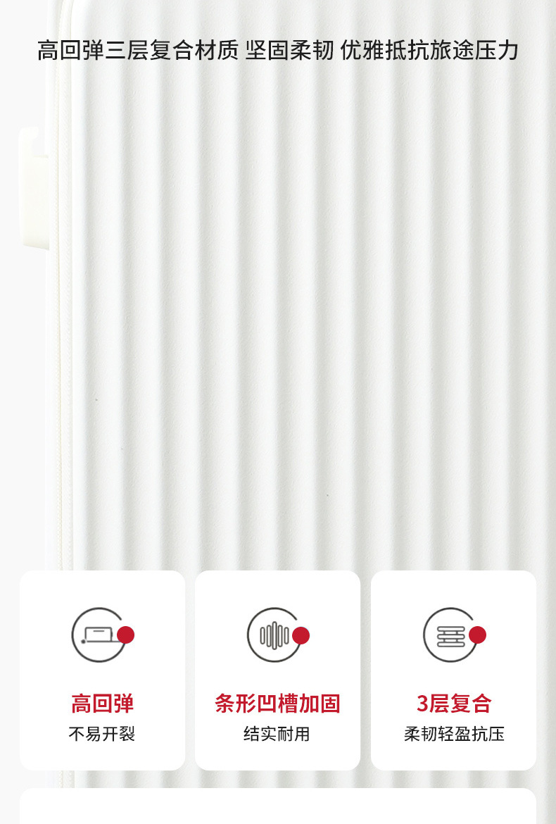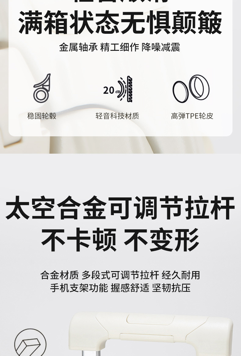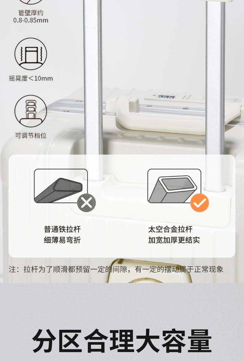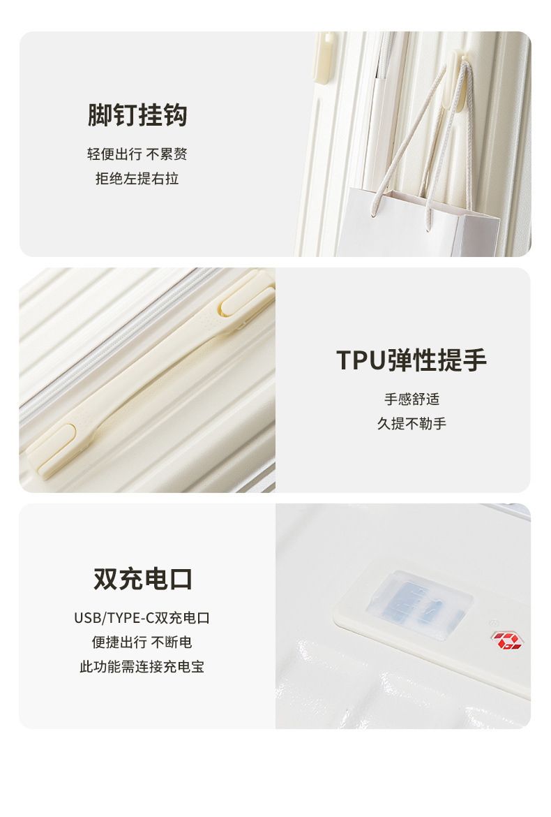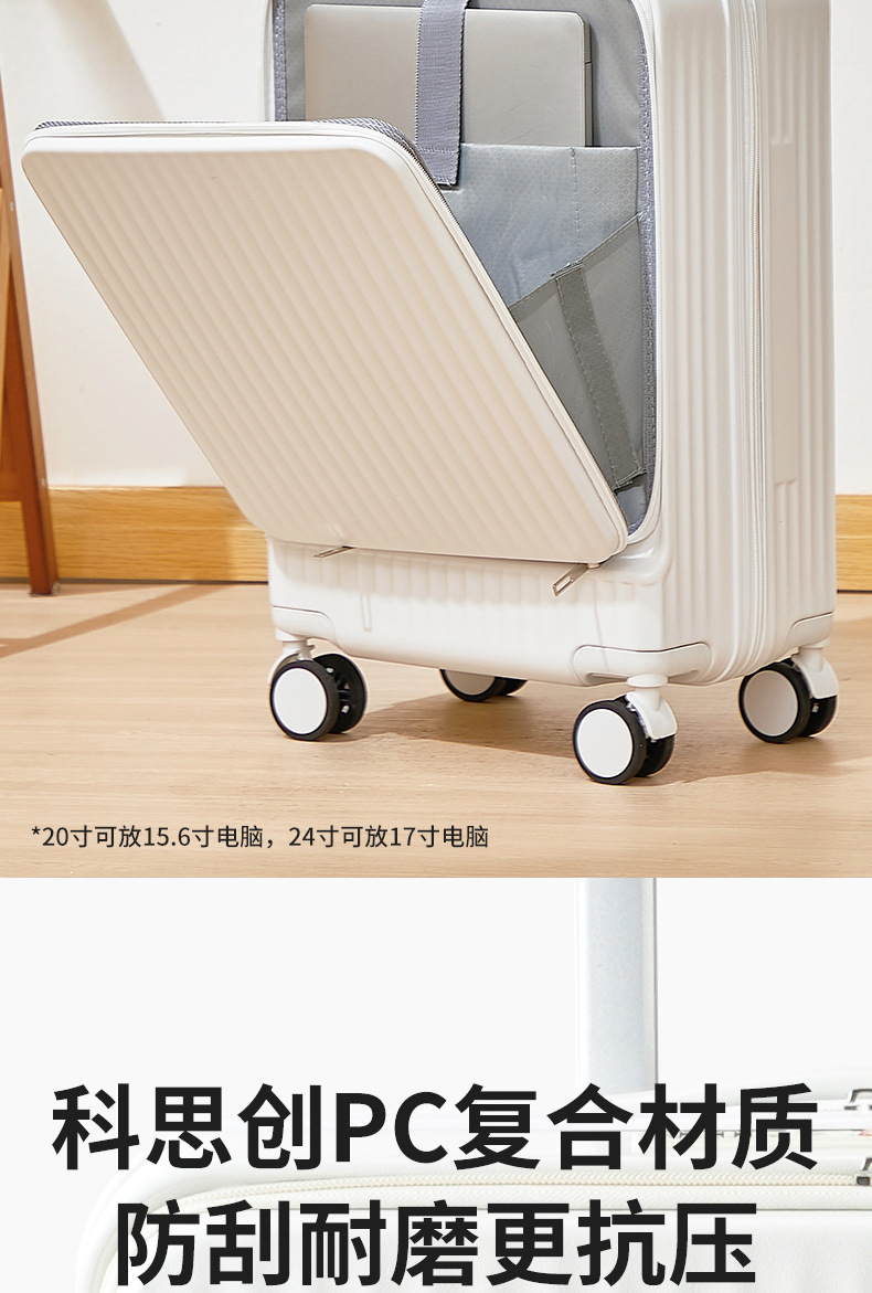 前开盖多功能行李箱 前开盖系列便携取物更方便 突破传统 速存快取优雅出行 前开盖多功能行李箱 新一代开合方式同等尺寸更能装脚钉挂钩|折叠杯架|USB充电口