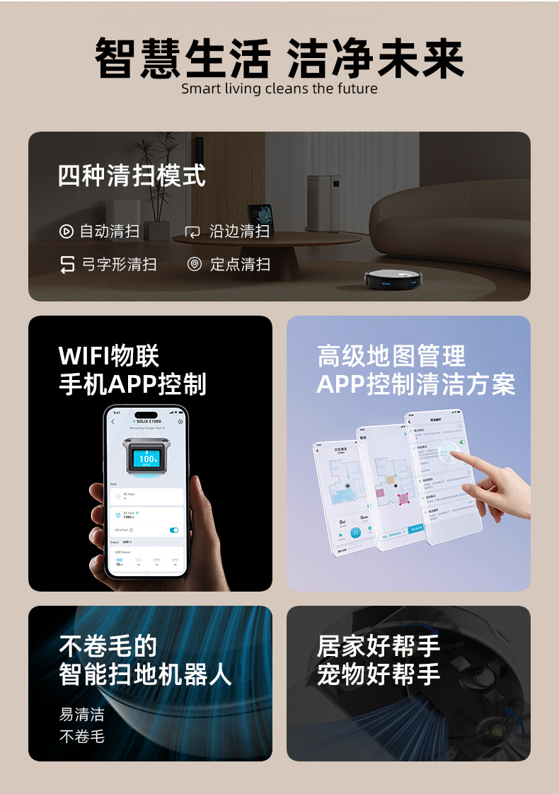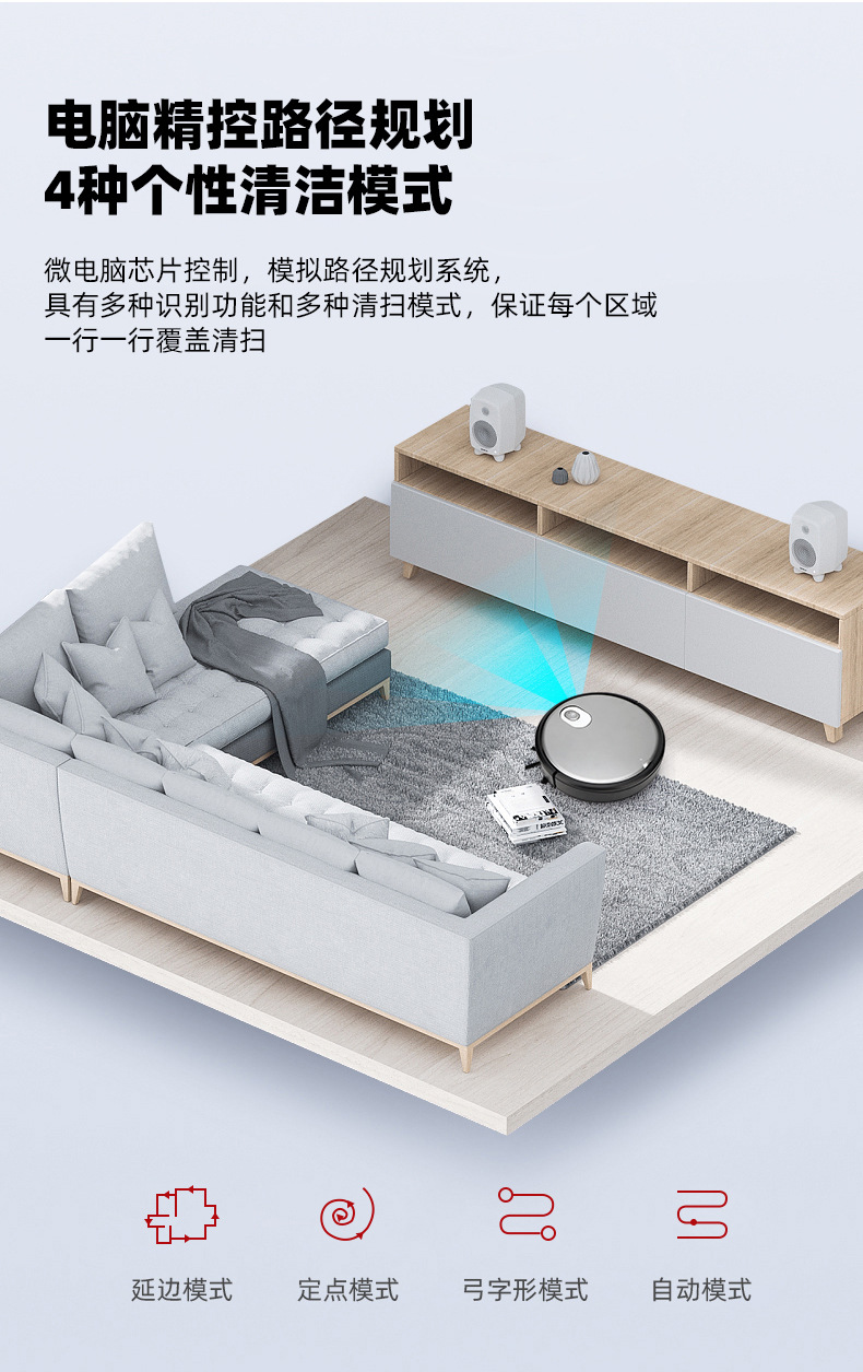 清洁性能:大吸力 + 多模式,适配全场景 强劲吸力与清洁配置:无刷电机提供 4000-6000Pa 大吸力,浮动滚刷 + 双边刷 + 气旋分离,有效清除灰尘、毛发、颗粒与缝隙污垢;扫拖一体机型配备电控水箱,精准控水适配木地板 / 瓷砖 / 地毯。 智能清洁模式:支持自动增压、地毯识别(拖布抬升)、沿边清洁、定点清扫与禁区设置,APP 远程启动 / 预约,适配日常维护与深度清洁。